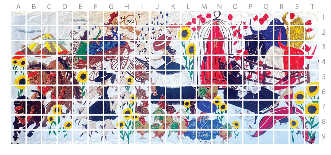 View the overview gridded map to explore available pieces and find the one that speaks to you. Use the dropdown below to select the corresponding coordinates.