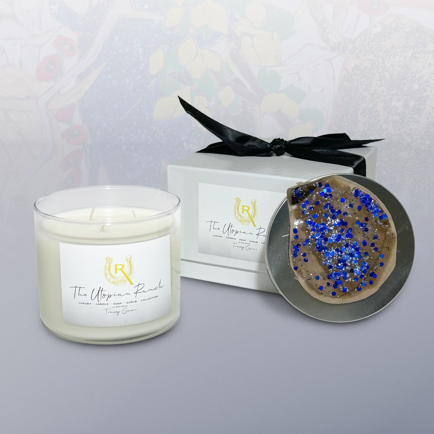 Three-wick scented candle featuring handmade component art from the Utopian Ranch installation.