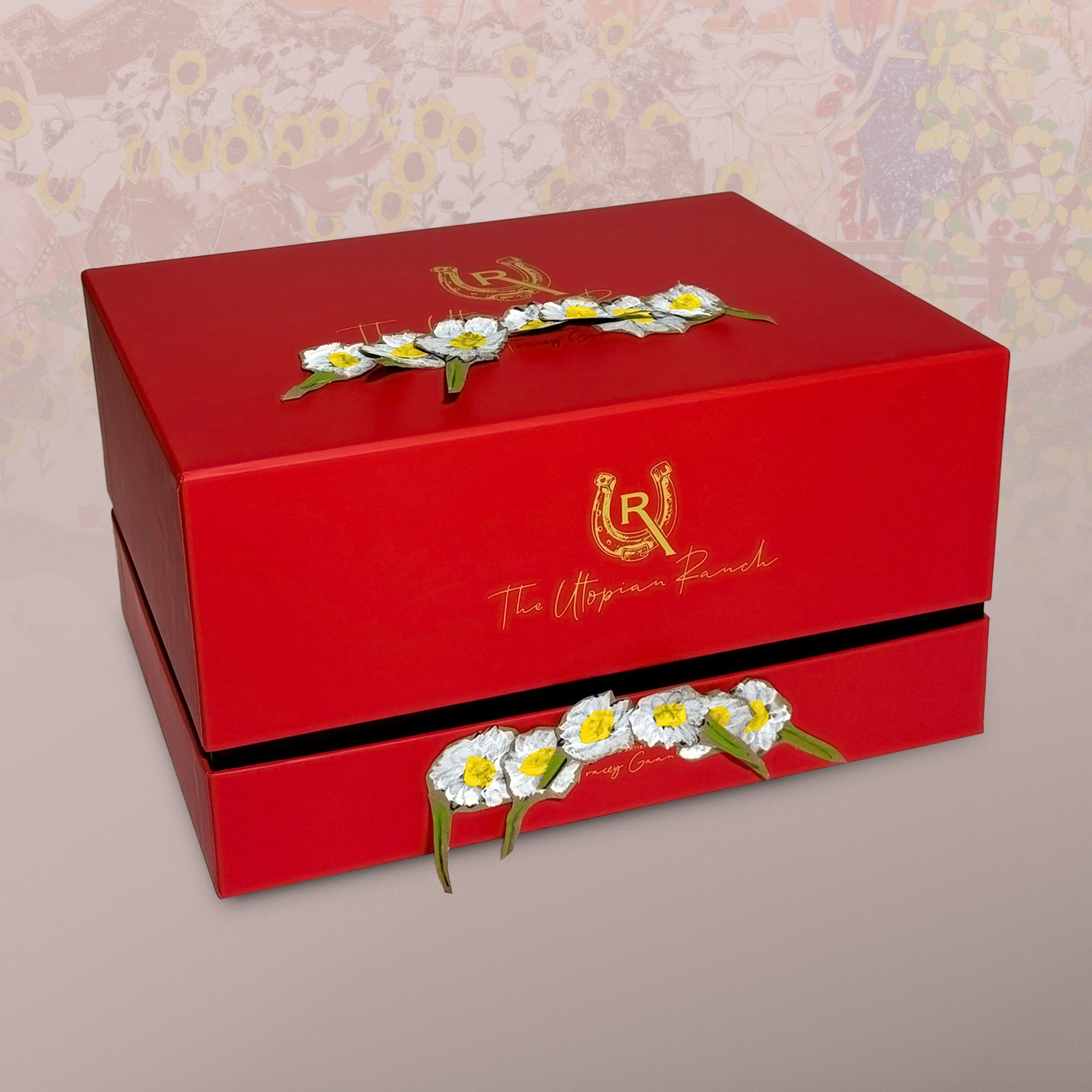 Each wish box is unique and embellished with handmade daisies. It includes 4″ x 4″ canvas components from the Utopian Ranch installation.